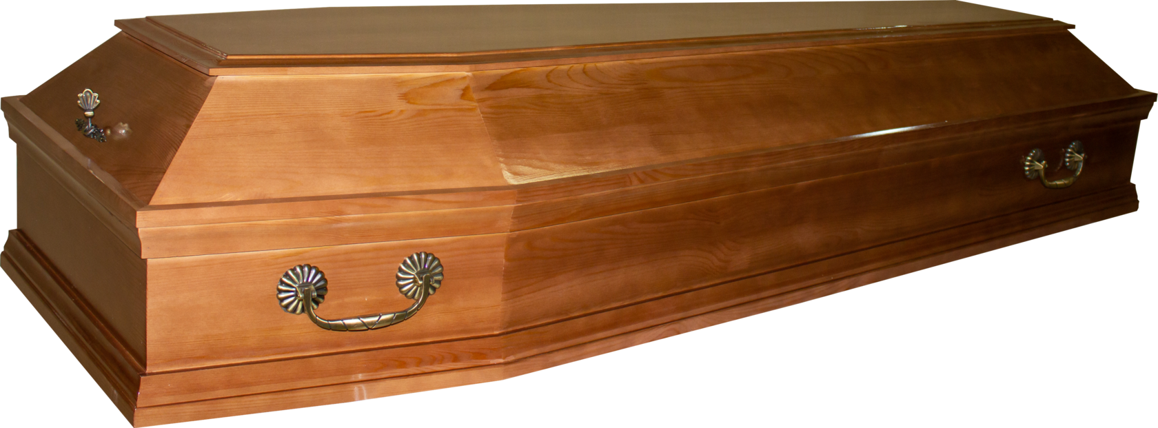 Лаконичный гроб отечественного производства. Выполнен из массива сосны. Матовое покрытие. Представлен в ореховом цвете. Четыре ручки для транспортировки.